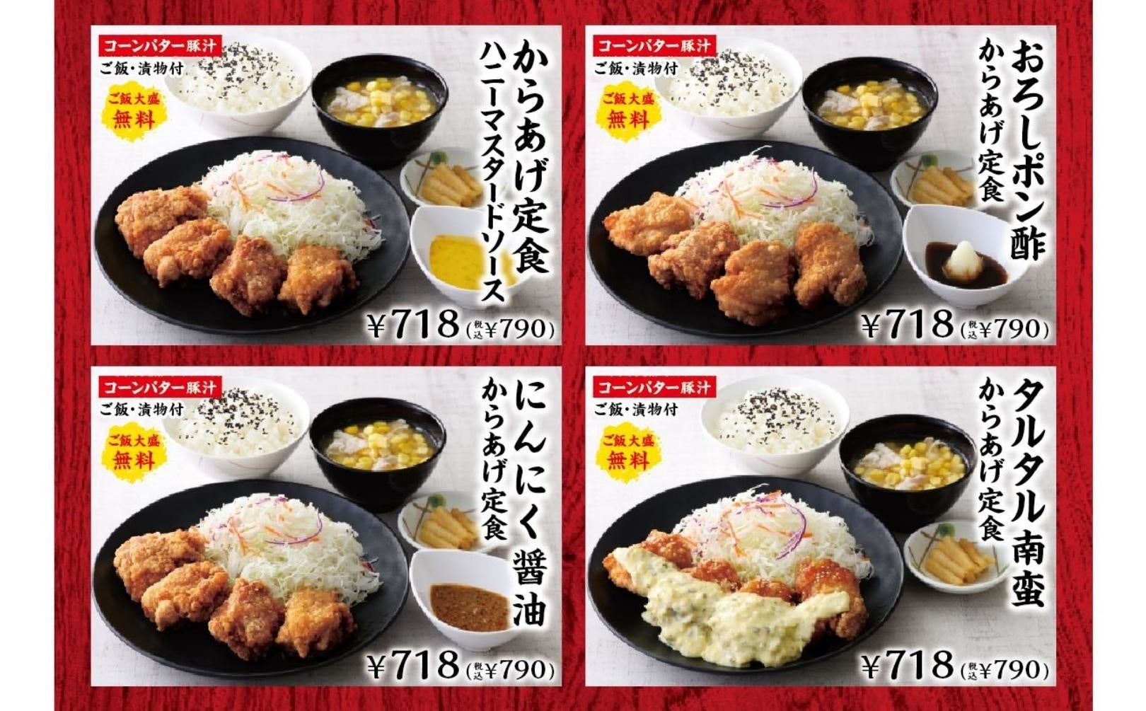 他にも、さっぱりポン酢で定番人気の『おろしポン酢からあげ定食』や、にんにくの風味が後を引く『にんにく醤油からあげ定食』、程よい酸味が絶妙なバランスの『タルタル南蛮からあげ定食』と、どれも魅力的なラインナップを取り揃えております。
