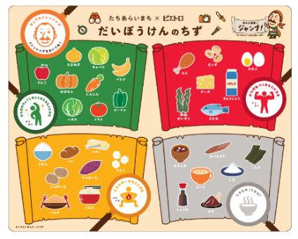 本イベントでは、クイズや工作を通して食材や食べることの魅力を伝え、「野菜を食べることができた!」という成功体験を子どもたちに味わってもらうと共に、食事を作ってくれる方や生産者へ感謝の気持ちを持てるようにし、子どもの頃から自然と食への関心と知識を持つことで、健康的な成長をサポートすることを目的としています。今回のテーマは「食の大冒険へジャンプ!」。園児もスタッフも“勇者”になりきって、楽しくイベントを盛り上げます。さらに、イラストで『食材の色分け』を楽しく描いたランチョンマット(町とピエトロの共同制作)を配布し、自宅での食育にも繋げます。