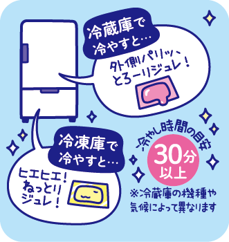 冷蔵庫で冷やすととろ~りジュレが、冷凍庫で冷やすとねっとりジュレが楽しめます。冷やさずにそのままはもちろん、異なる食感を是非お試しください♪