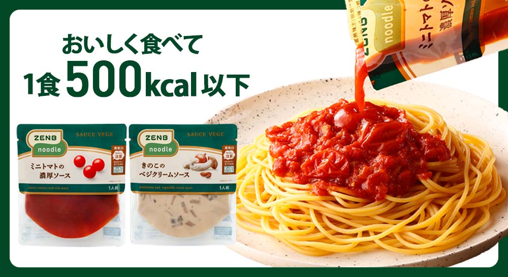 さらに、そうめんだけでなく、汁そばやまぜそばなどメニュー広がる「ZENBヌードル細麺」は、冷製パスタとしても使える万能麺。ZENBのこだわり素材をつかった野菜パスタソースをアレンジして簡単に調理も可能。冷蔵庫で冷やしたパスタソースを、ゆでて水で締めた細麺にかけるだけで、暑い日にもさっぱり食べられる冷製パスタがお楽しみいただけます。しかも1食500kcal以下。食物繊維やたんぱく質もとれる、おいしくてカラダにいい食生活で、今年の夏は理想のカラダに。