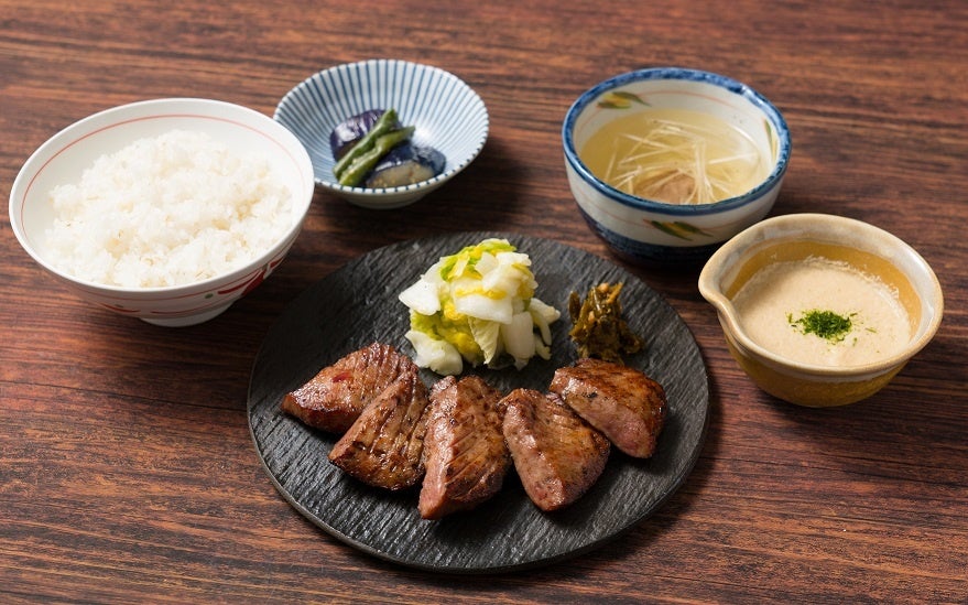 また,外が香ばしく中はジューシーな「牛タン」,国産米と押し麦をふっくらと炊き上げた「麦飯」がセットの牛タン焼きご一緒にお楽しみいただけます。