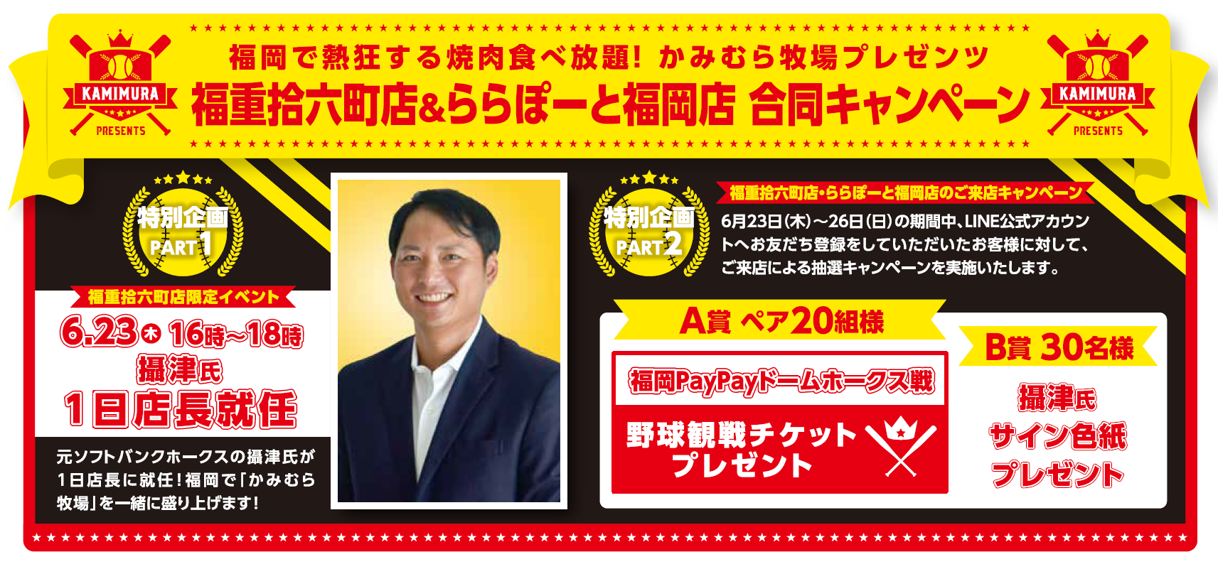 この度の合同キャンペーンは第一弾として、開催初日となります23日に本拠地を福岡とするソフトバンクホークスでかつて投手としてご活躍されました攝津氏が1日店長としてグランドオープンしたて福重拾六町店に就任、様々な制限が解除された福岡の夏を盛り上げようと「かみむら牧場」へご来店の皆様に「幸せの焼肉食べ放題」をご提供いたします。