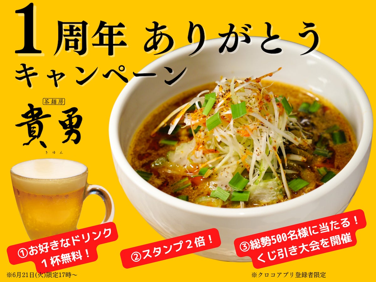 株式会社クロコ(本社:東京都中央区、代表取締役:大和田大地)が運営する「茶麺房 貴勇(さめんぼう きゆん)」は、2022年6月21日でオープン1周年を迎えます。日頃のご愛顧への感謝を込めて、「1周年ありがとうキャンペーン」を6月21日(火)より開催いたします。