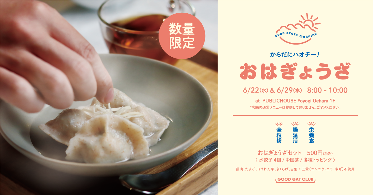日本中の愛すべき食を集めたEC「GOOD EAT CLUB」を運営する株式会社グッドイートカンパニー(本社:東京都渋谷区、代表取締役CEO:楠本修二郎/以下、グッドイートカンパニー)は餃子超人オガサワラガクさん、餃子のかわしもさんと朝に食べる水餃子「おはぎょうざ」を6月22日(水)、6月29日(水)期間限定で、代々木上原の「PUBLIC HOUSE Yoyogi uehara」にて店頭販売を実施します。