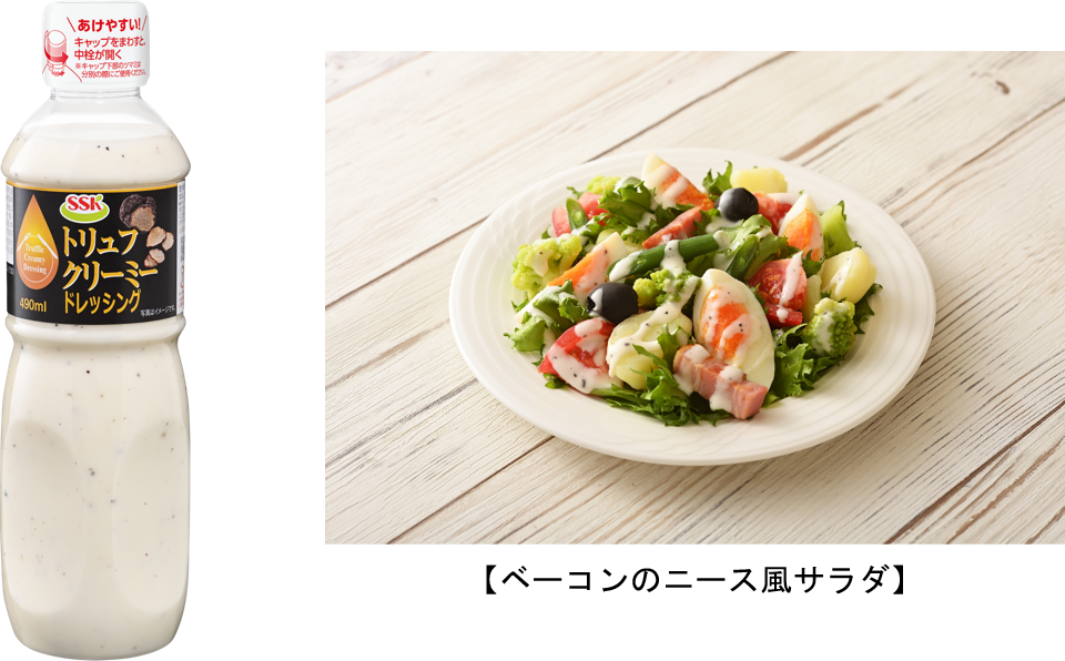 「SSK トリュフクリーミードレッシング」は、黒トリュフを使用し、香り高いトリュフ風味を堪能できるドレッシングです。サラダはもちろん卵料理や肉・魚料理によく合い、手軽にトリュフ風味を味わうことがで