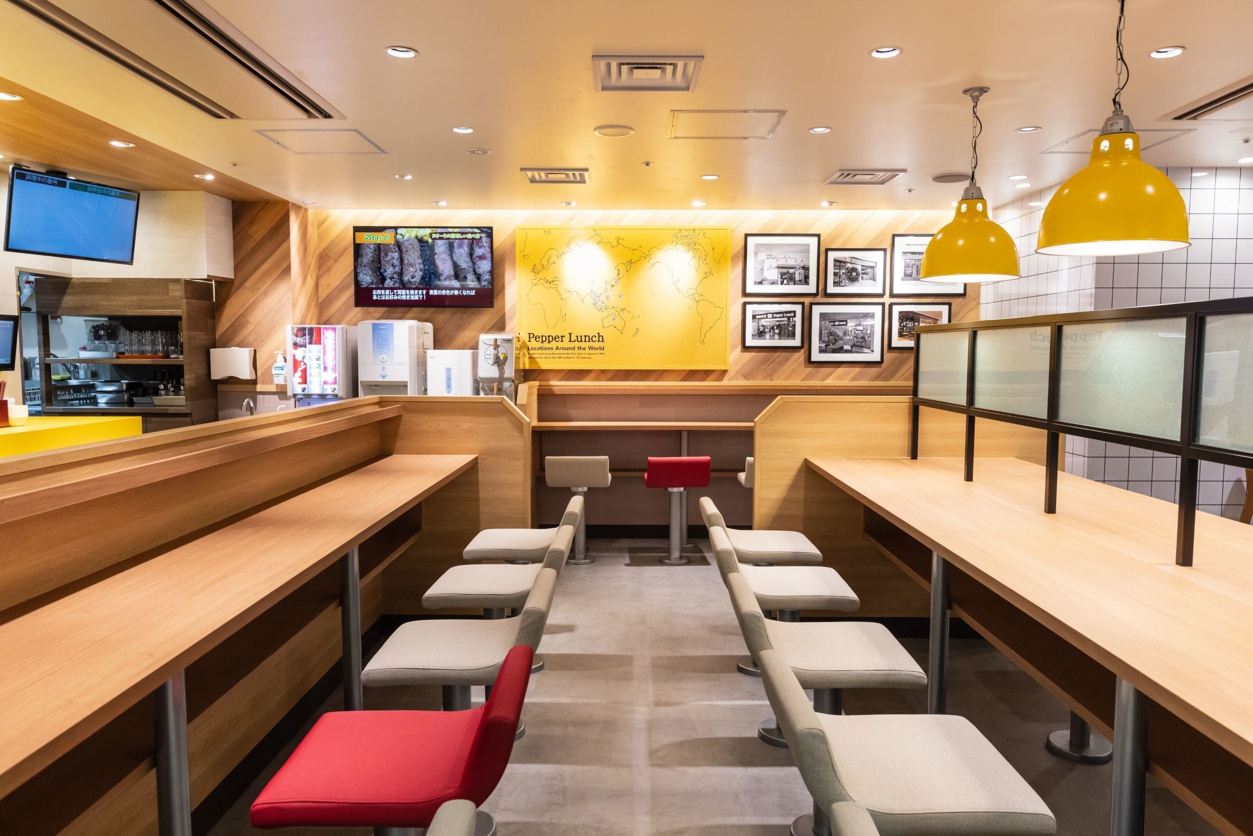ペッパーランチ⼋重洲地下街店は、従来のホールスタッフによる提供方式からセルフ提供方式への変更や、厨房機器の見直しにより、厨房を小型化したことで、従来よりも客席のスペースを広く取り、十分な座席の間隔を確保しています。
