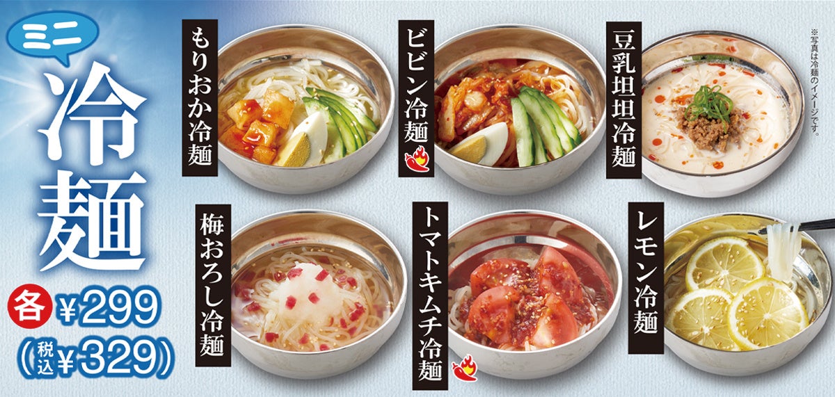 王道の「もりおか冷麺」、ちょい辛がクセになる「ビビン冷麺」、ヘルシーで濃厚な「豆乳坦坦冷麺」、〆はサッパリとこれ!「梅おろし冷麺」、相性抜群コンビ「トマトキムチ冷麺」、甘酸っぱさがたまらない夏の風物詩「レモン冷麺」。ミニサイズで提供しておりますので、食べ放題にはちょうど良いサイズ感です。