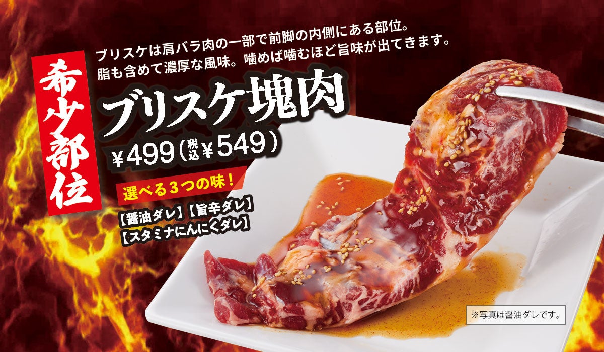 ブリスケは肩バラ肉の一部です。噛めば噛むほど旨味が出てくる濃厚な味‼焼肉ダレは醤油ダレ、旨辛ダレ、スタミナにんにくダレの3種類からお選びいただけます。ブリスケをいっぱい食べて夏の熱さを乗り越えましょう♪