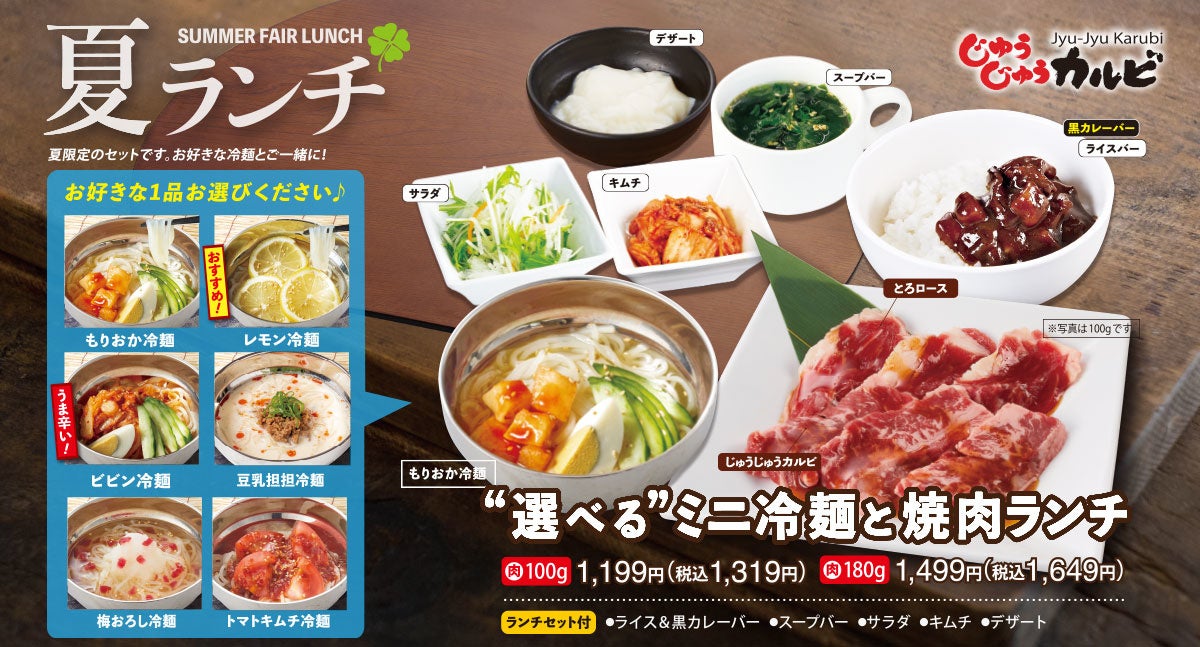 “名物“「じゅうじゅうカルビ」と人気商品の「とろロース」がタッグを組んだお得なランチ。セットのミニ冷麺は6種類からお選び頂けます。さらにサラダとキムチとデザートがついて、ライスとカレーとスープが食べ飲み放題です!お肉も100gと180gからお選び頂けます。何度頼んでも楽しめる、夏の超お得メニューです♪