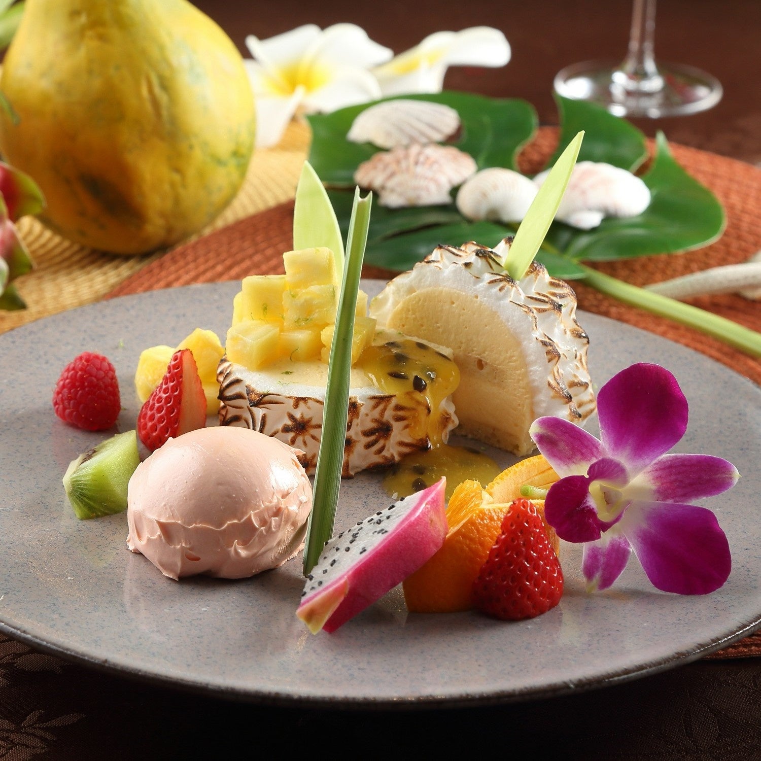 パイナップルをイメージした、パイナップルとリリコイのアイスケーキとココナッツ生地、メレンゲを組み合わせた「ベイクドアラスカ」にグアバアイスクリーム、パイナップルとリリコイシードのソースを添えました。