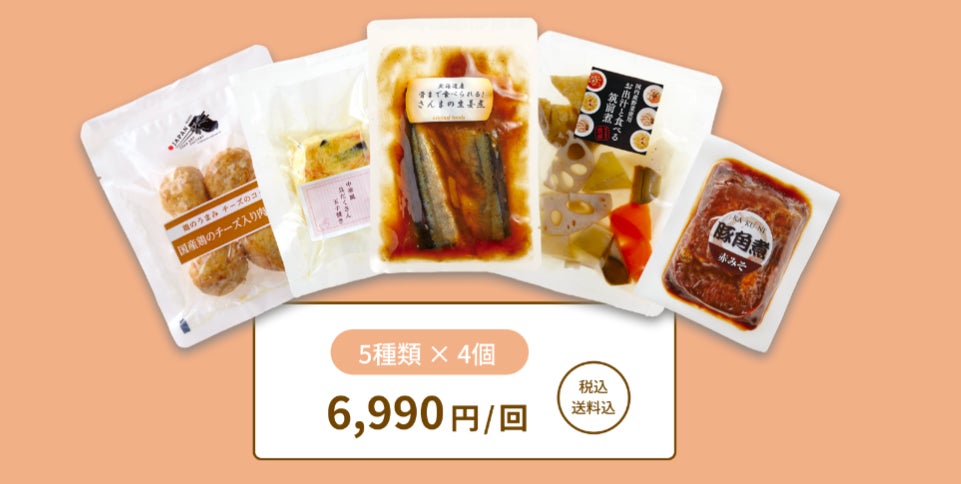 『おかずストック』は、個人宅に安心素材なのに冷蔵庫で2週間日持ちするおかずを提供するサービス。6,990円/回で、隔週20個のお惣菜をお届けします。1袋ごとに小分けされたお惣菜なので、夕食の副菜として、在宅勤務のお昼に、日常のいろんなシーンをサポートすることが可能です。