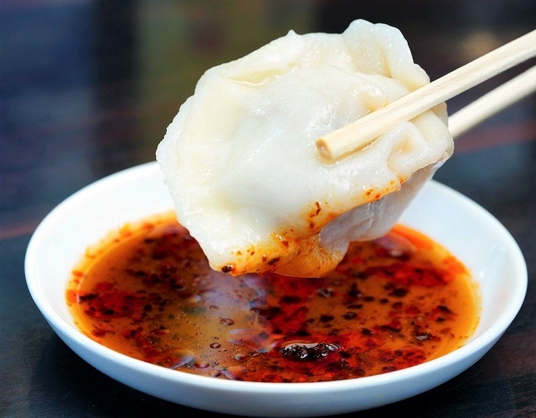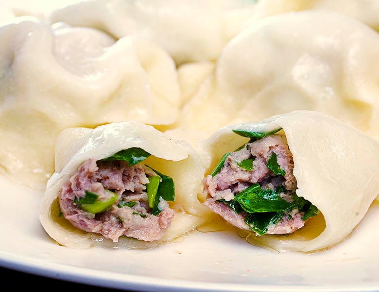 豚肉餃子に入る野菜はニラです。これが四川の家庭の味です。豚の甘みとニラ独特のくせがたまりません。豚肉は国産で、赤身:脂=8:2の割合の粗びきです。具には、豚骨と鶏ガラでとったスープを練り込みます。そうすることで、噛んだ瞬間にびゅっと肉汁があふれます。味付けは、花椒、胡椒、塩、胡麻油です。醤油や餃子のタレが無くても美味しい、しっかりとした味付けで楽しませてくれます。