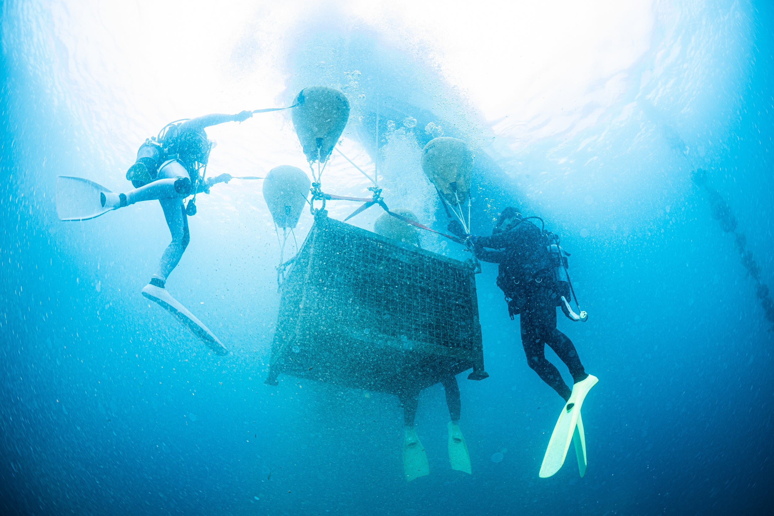 海底貯蔵庫は、国立公園に面しありのままの自が残された伊豆有数の透明度を誇る奥石廊中木沖。伊豆半島の最南端にあるこの海は、冬は荒れ海となることで瓶内のワインへ影響を与えると考えられています。また、中木川より注ぎ込む冷たい水により水温を低く保ち、ワインの熟成に適した環境となります。