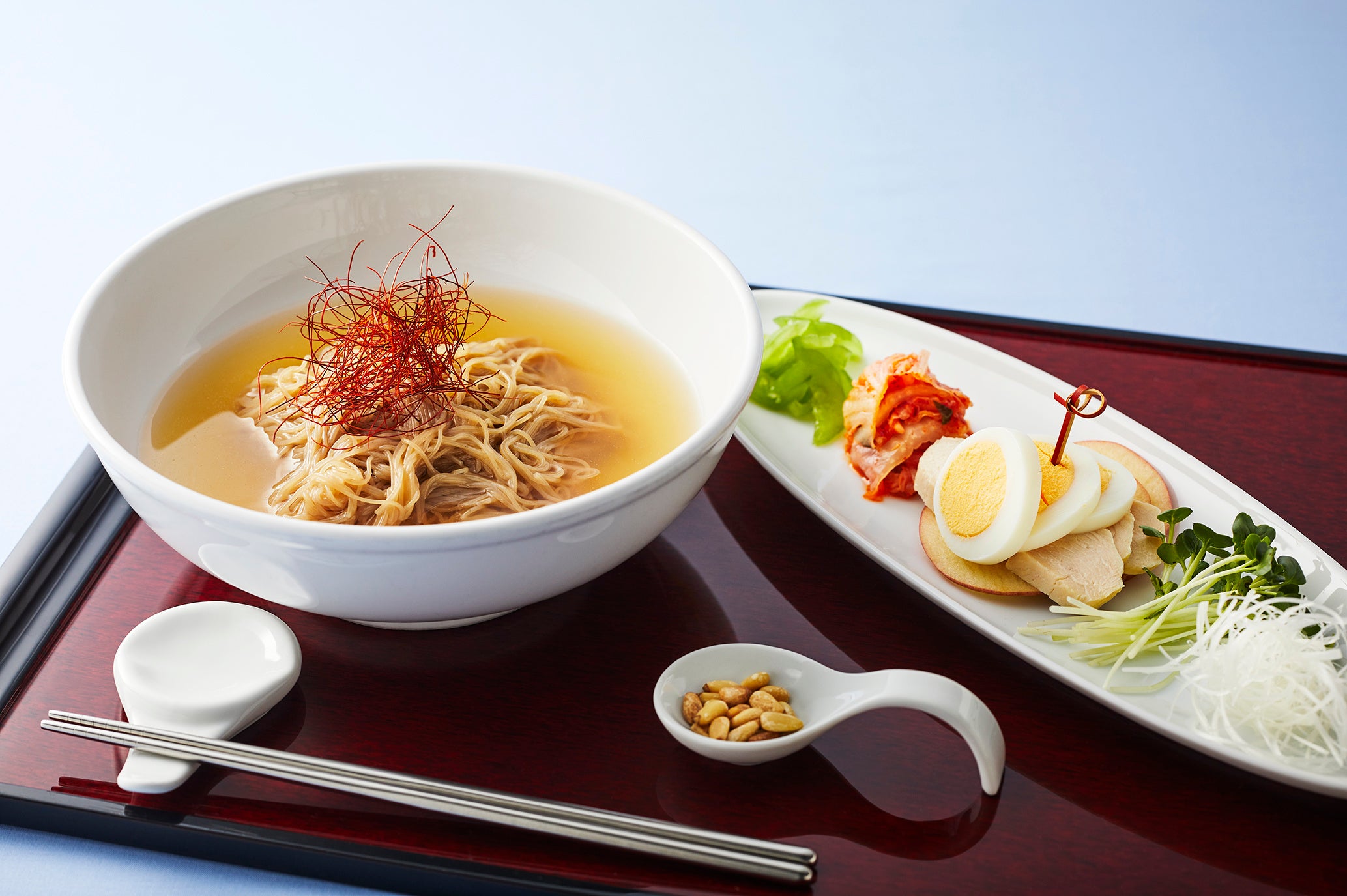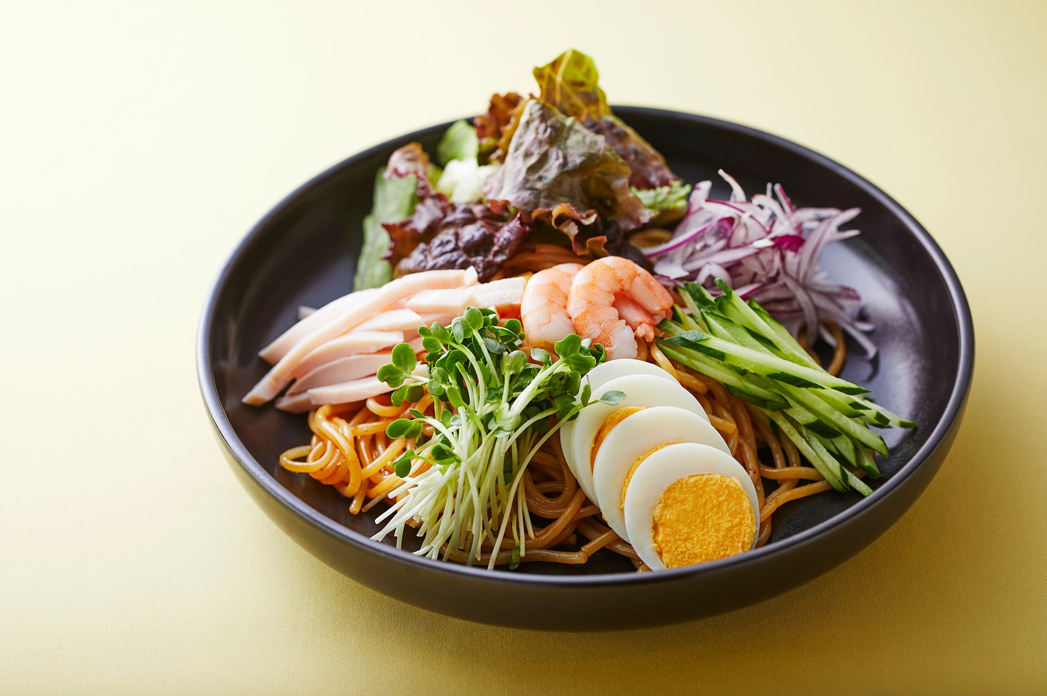 程よいフルーツの酸味が心地よい「冷麺」は暑い夏でもさっぱり味わうことができ、蒸し鶏や白菜キムチなどトッピングをお好みの順番で加えながら、味の変化もお楽しみください。