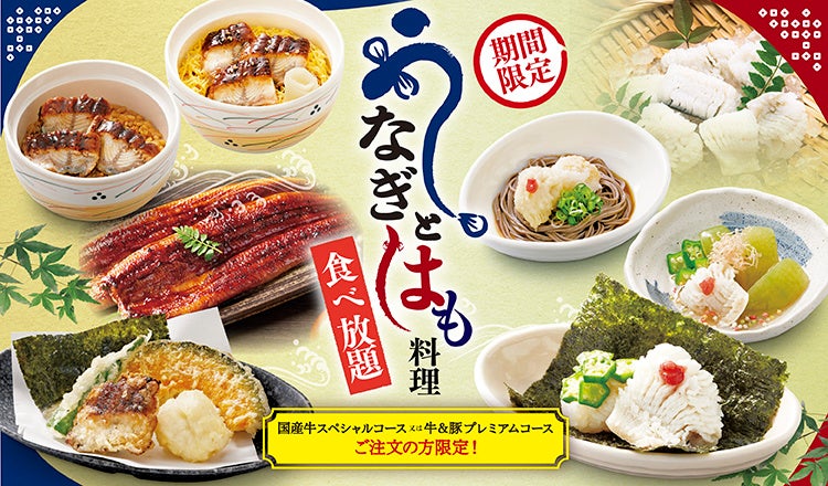 お得なこの機会に、夏の風物詩…「うなぎ」「はも」を使った特選料理の食べ放題を是非お楽しみください。