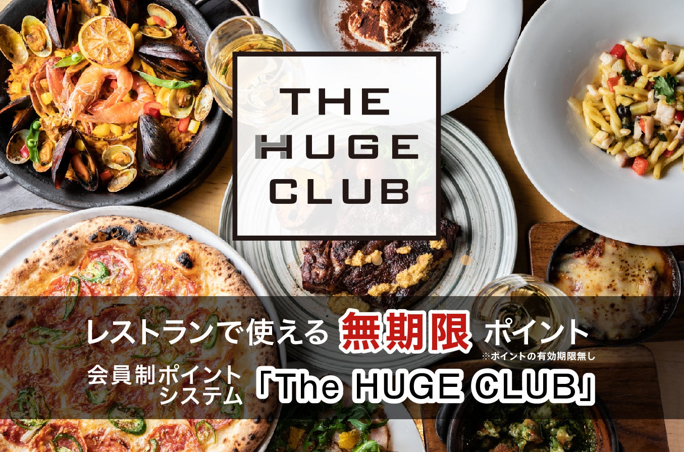 HUGEが運営するDAZZLE(ダズル)やRIGOLETTO(リゴレット)、Hacienda del cielo(アシエンダ デル シエロ)など国内29のレストランをThe HUGE CLUBよりご予約頂くと、ご飲食代の5%(ランチタイムは2%)をポイントバックする会員制ポイントシステムです。このポイントは、次回以降店舗利用時に 1ポイント=1円 としてご利用いただける、有効期限無しの「無期限ポイント」です。