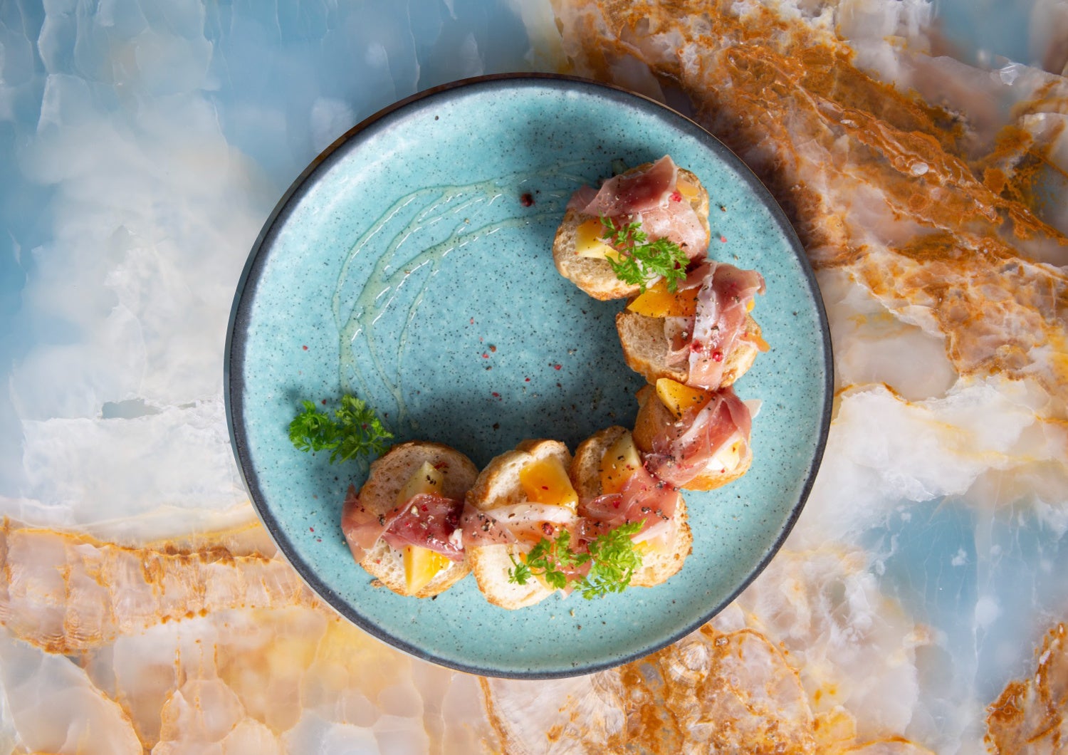 サクサクに焼き上げたバケットにマスカルポーネチーズ、パパイヤ、プロシュートを乗せ、マカダミアナッツの花から採取したハチミツをかけて仕上げています。