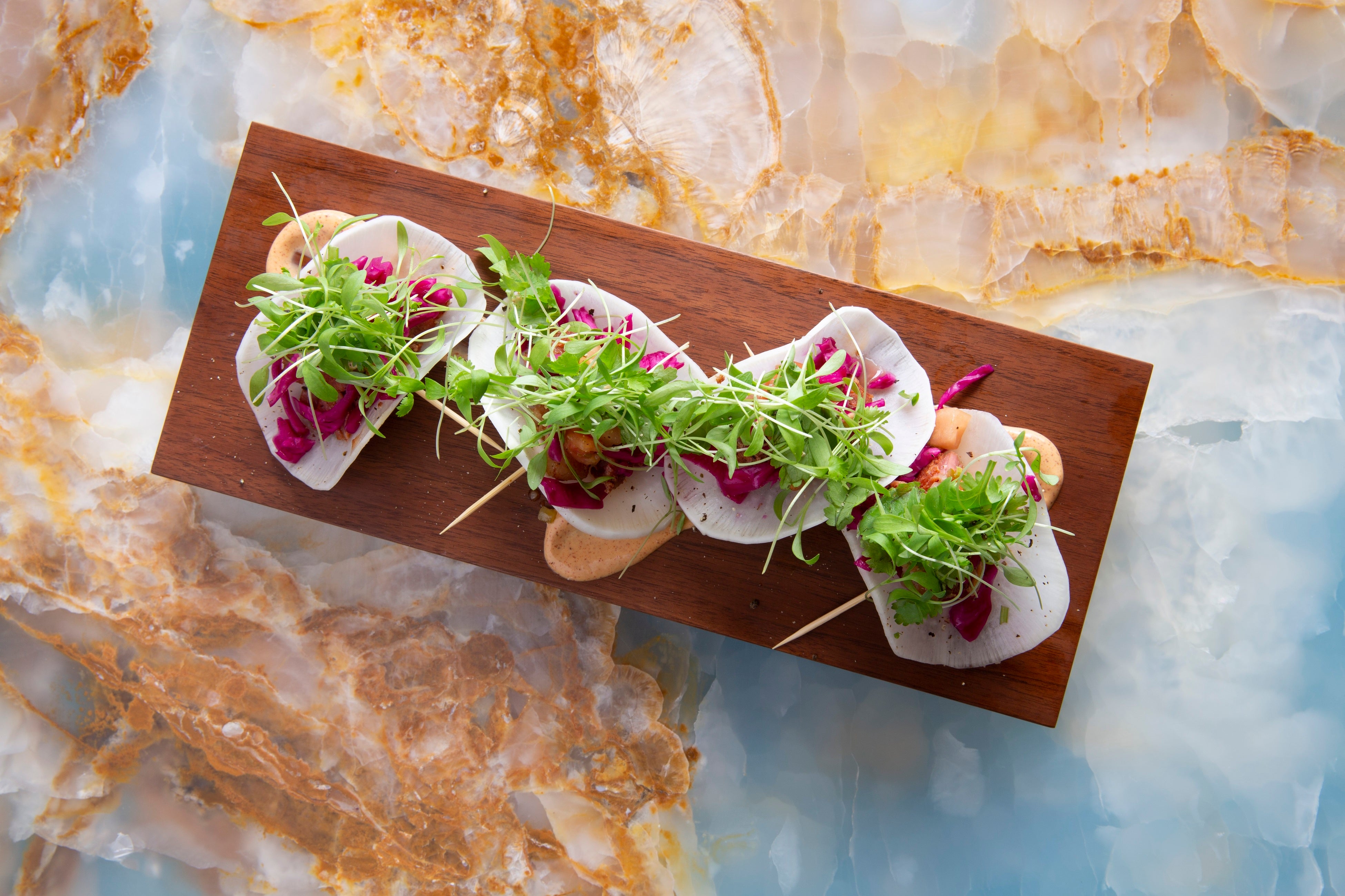 スパニッシュの前菜からは、“TACO” PINCHO DE CERDO。薄くスライスした大根をタコスのトルティーヤに見立て、カルニタスの上にはピリと辛いチポトレとマヨネーズを合わせた特製ソースを。