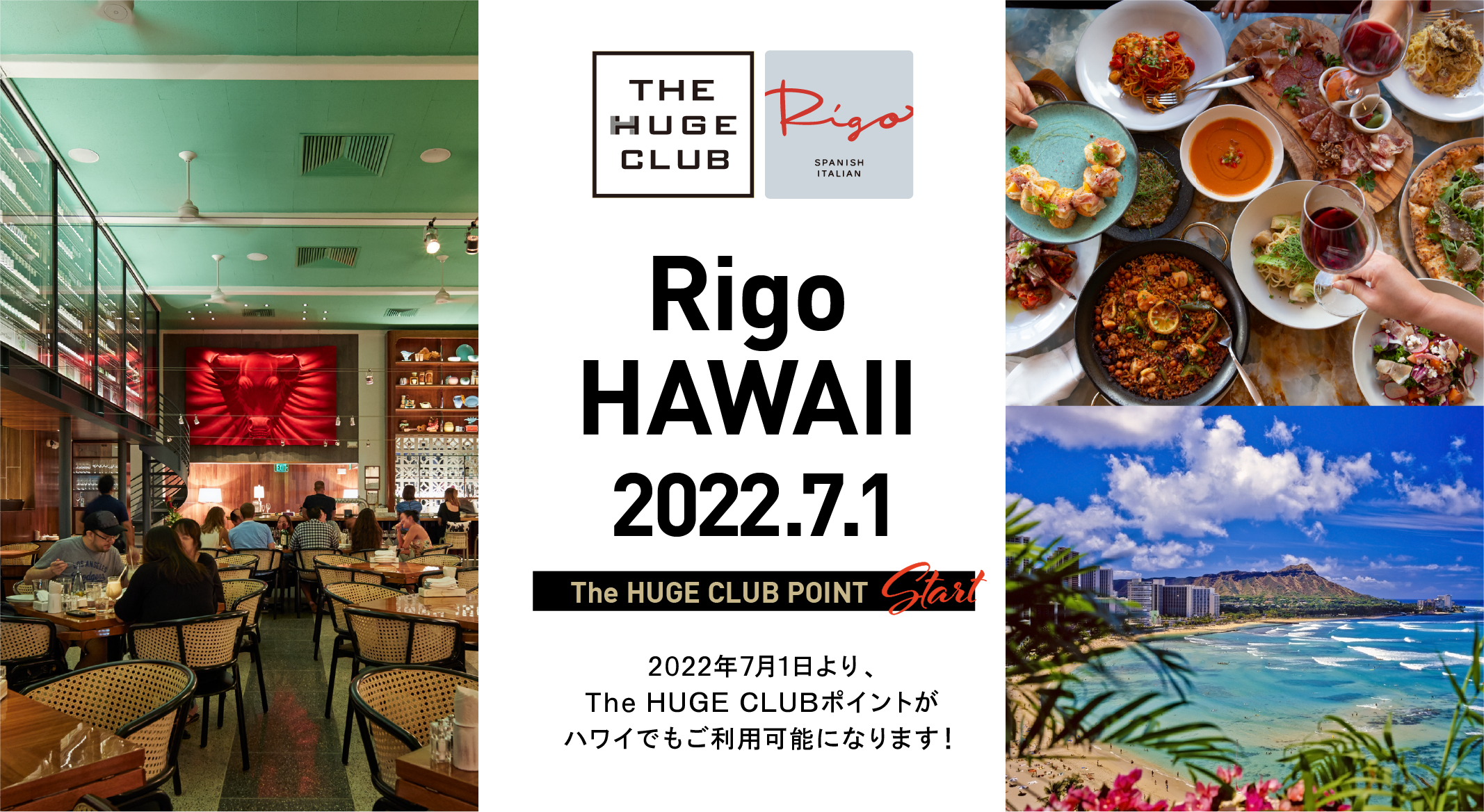 東京・横浜を中心に京都・沖縄など国内に29店舗のレストランを展開する株式会社HUGE(本社:東京都渋谷区、代表取締役社長 兼 CEO:新川 義弘 以下HUGE)は、同社が運営する会員制ポイントシステム「The HUGE CLUB(ザ ヒュージ クラブ)」を、グループ会社のHUGE HOSPITALITY UNIVERSAL GROUP INC.が運営するハワイ・オアフ島の「Rigo SPANISH ITALIAN」でも2022年7月1日(金)よりサービス提供を開始します。