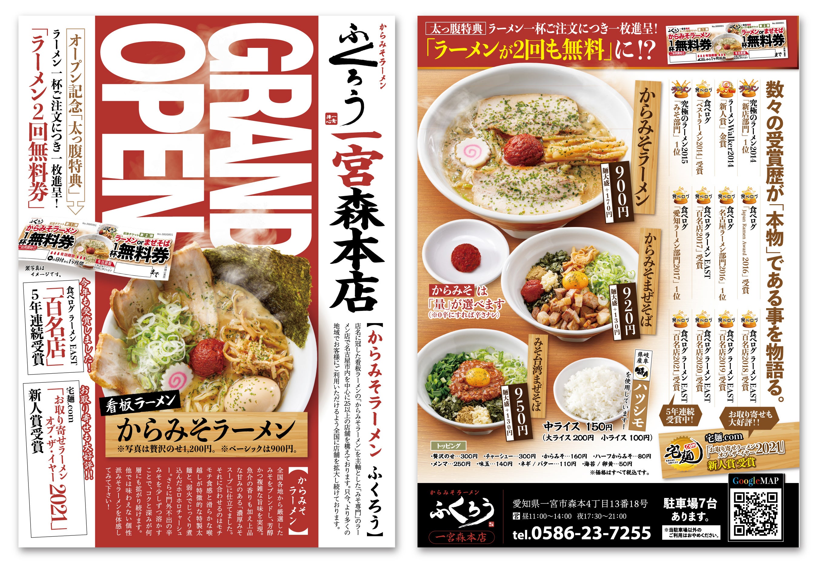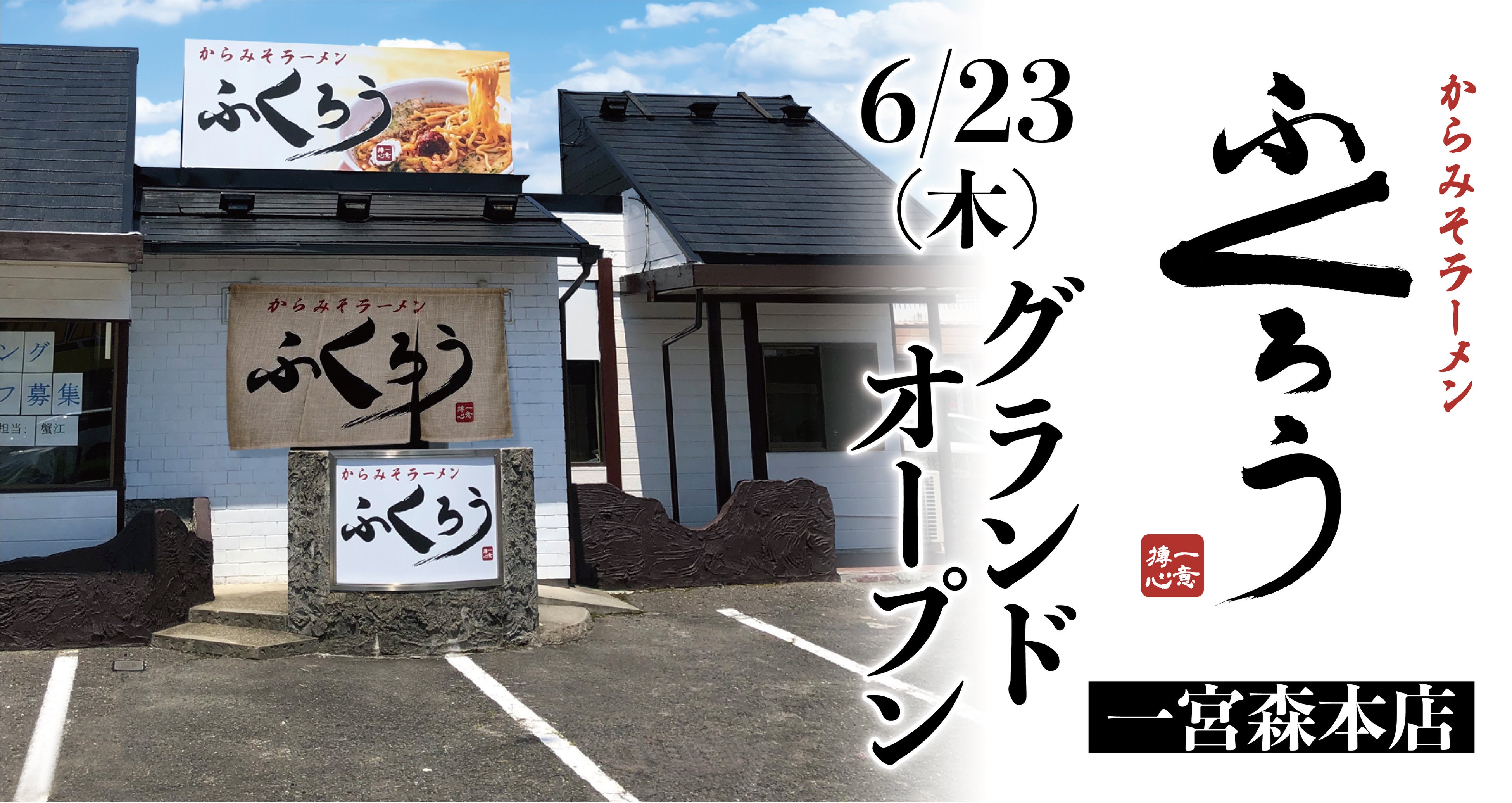 株式会社パッシオーネ(本社:愛知県名古屋市/代表取締役社長:佐藤智雄)が運営する『からみそラーメンふくろう』は、2022年6月23日(木)に、一宮市・初出店となる『からみそラーメンふくろう 一宮森本店』をグランドオープンいたします。オープン記念といたしまして、ご来店頂いたお客様に「2回使えるラーメン無料券」など太っ腹特典を用意しております。
