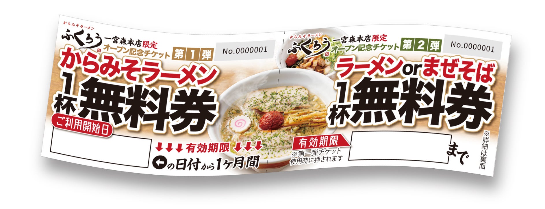 からみそラーメンふくろう一宮森本店では、オープン記念「太っ腹特典」といたしまして、お好きな麺類一杯ご注文につき一枚「2回使えるラーメン無料券」をお配りしております!!これだけの特典ですからさすがに定員はございます。100名様まで?。いえいえ、今回はなんと3,000名様分も用意しちゃいましたー!この機会に是非、からみそラーメンふくろう一宮森本店をご利用ください!