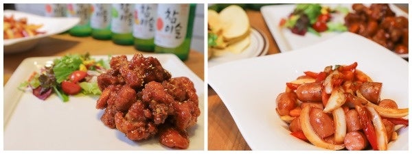 さらにお酒のおつまみとしてもピッタリな、ヤンニョムチキン、ソーセージ野菜炒め、チヂミも追加されます。中でもソーセージ野菜炒め(ソーセージヤチェポックム:通称ソヤ)は韓国居酒屋の定番メニュー。ケチャップとコチュジャンが合わさった素朴な味わいでお酒がすすみます。