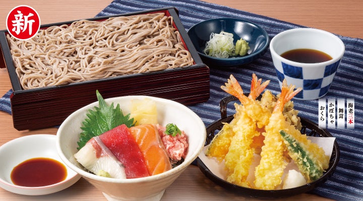 リニューアルしたそばに、海老天など揚げたてさくさくの天ぷらと、人気の海鮮丼を一挙に楽しめる、大満足間違いなしの御膳です。