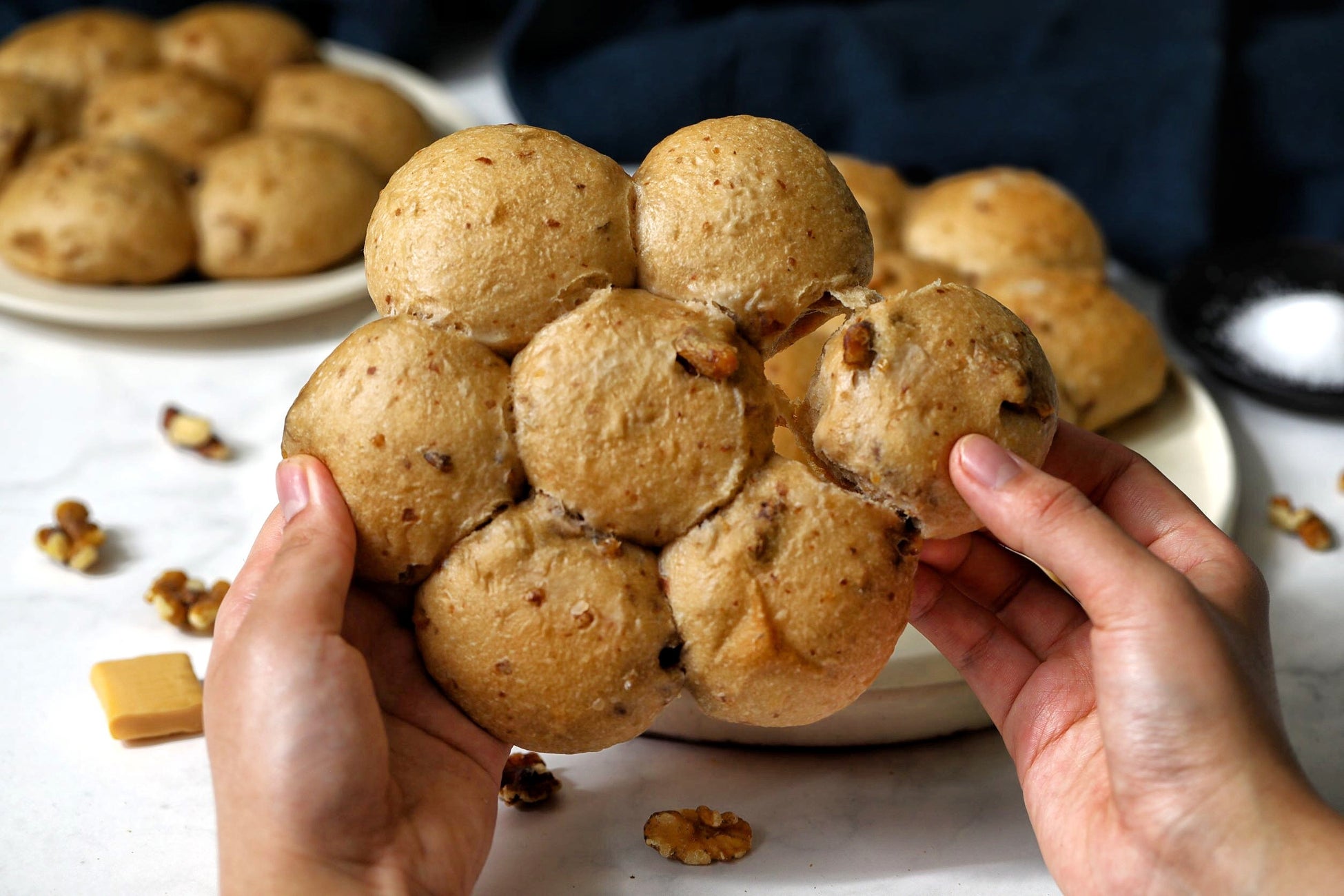 しっとり、もっちり引きのある日本人好みの食感で、口どけよく飽きのこないシンプルな味わいが人気の京生ちぎりパン。7-8月限定商品は、キャラメル風味の生地に、ローストしたくるみを混ぜて焼き上げたあと、岩塩をトッピングした塩キャラメルのようなフレーバーをご用意いたしました。