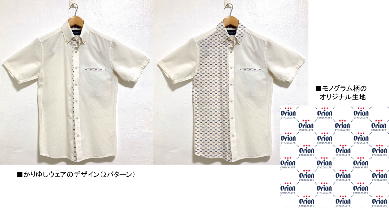 また、同じくバガスから生まれた生地で作った「かりゆしウェア」も登場します。オリオンビールのロゴマークをモノグラム調に配置したシンプルなデザインは、沖縄のリゾートウェアとしての使用はもちろん、夏場の日常利用にもぴったりな一着。沖縄の縫製工場にて一つひとつ仕立てます。