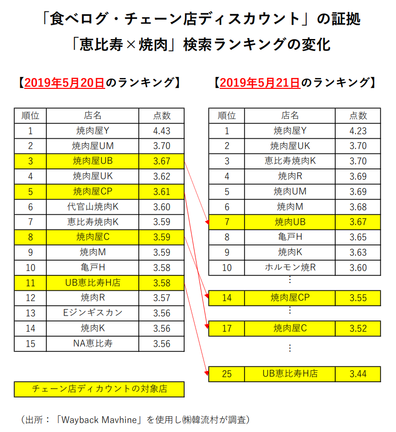 以下の食べログの「恵比寿 X 焼肉」ランキング例が示すとおり、2019年5月21日を前後に、チェーン店の点数とランキングが大幅に下がり、食べログユーザーが実際につけた点数とランキングとは全く違うランキングが表示されることによって、競争環境は歪められ、食べログユーザーは誤った選択を強いられ、点数とランキングを恣意的に下げられた対象店舗は客足と売上の減少を強いられました。