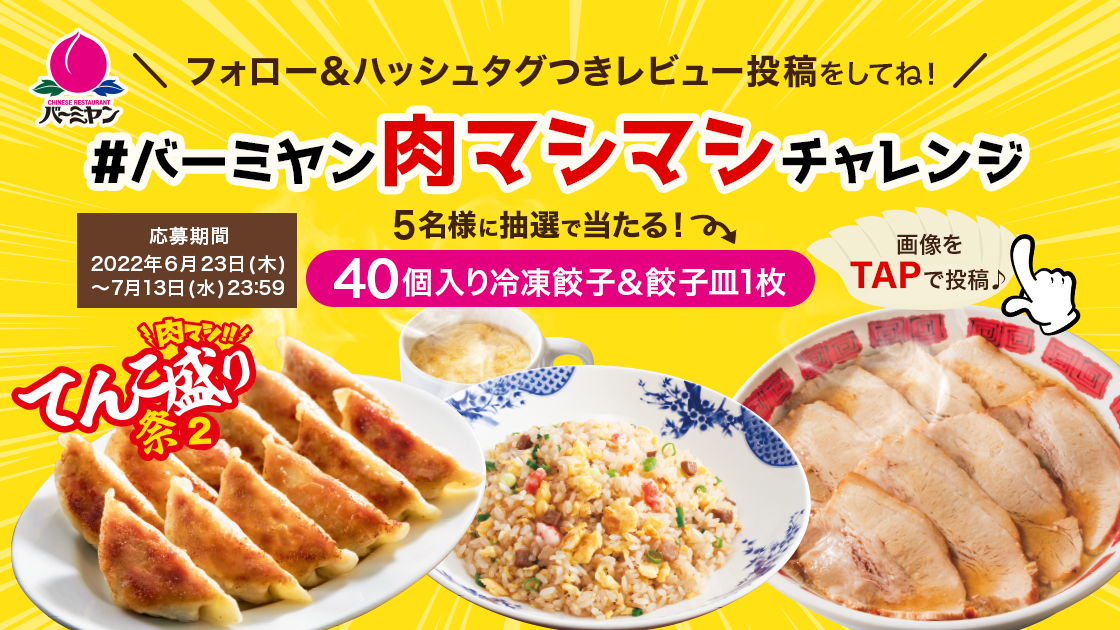 期間中、Twitterで「#バーミヤン肉マシマシチャレンジ」をつけて投稿すると、抽選で40個入り(目安)冷凍餃子&バーミヤングッズ(餃子皿)が当たるキャンペーンを実施いたします。