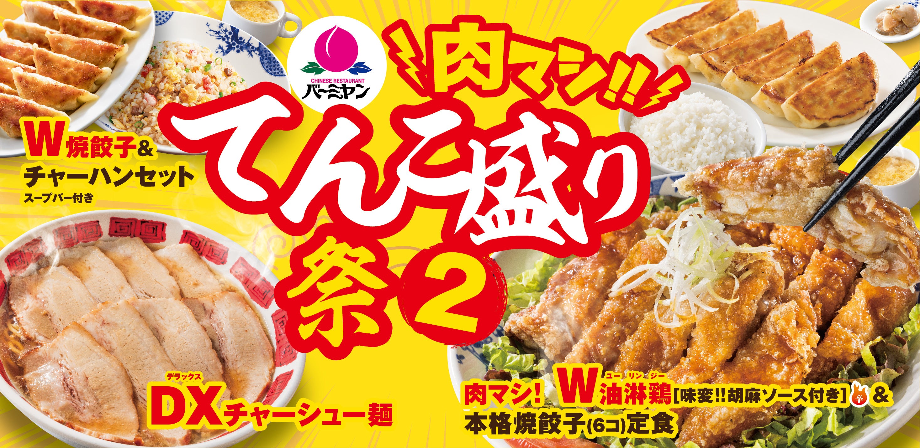 | 【バーミヤン 肉マシ‼てんこ盛り祭2 ポイント】 ①W油淋鶏は大判からあげが2枚!400gのご飯と餃子がついた大満足定食 てんこ盛り祭2のテーマは「肉マシ‼」。Wの油淋鶏セットはボリューム満点で満腹間違いなしです。 ②自家製チャーシューがマシマシの8枚!お肉の下も具だくさんラーメン ③#バーミヤン肉マシマシチャレンジ でバーミヤングッズ&冷凍餃子が当たる! |