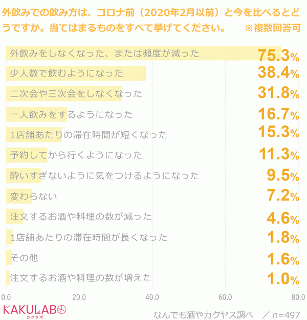 このたびのコロナ禍によって、私たちのライフスタイルは大きく変わりましたが、外飲みについてはどうなのでしょうか。そこで、コロナ前(2020年2月以前)と今を比べて、外飲みでの飲み方はどうなのかを複数回答可で聞いてみたところ、圧倒的に多かったのが「外飲みをしなくなった、または頻度が減った」で75%でした。