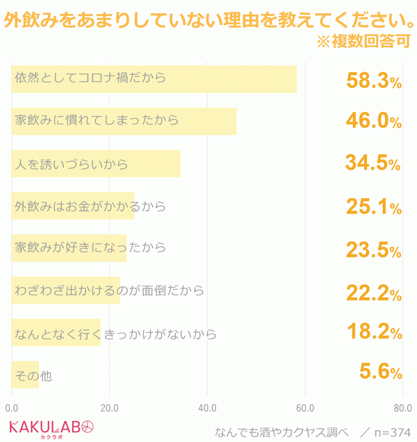 そこで、「外飲みをしなくなった、または頻度が減った」と回答した人に対して、その理由を複数回答可で聞いてみました。最も多かったのは「依然としてコロナ禍だから」で58%、次いで、「家飲みに慣れてしまったから」46%、「人を誘いづらいから」34%と続きます。