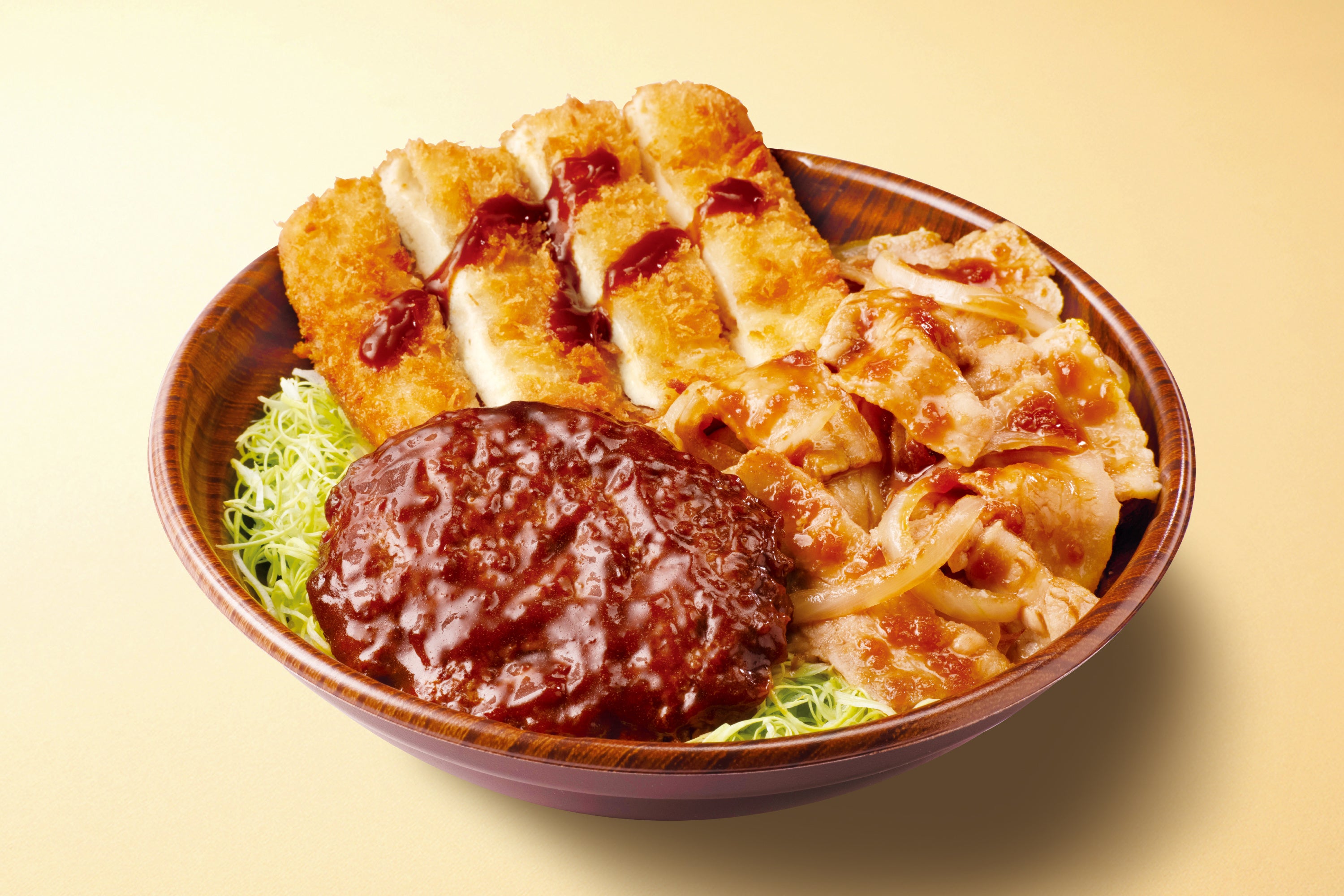 今月の「肉トリプル丼」は、具材感がアップしたタレの生姜焼き1食、肉感たっぷりで柔らかジューシーなデミハンバーグ1個、軽い食感でチーズがほのかに香るチーズチキンカツ1枚に千切りキャベツがのった丼です。