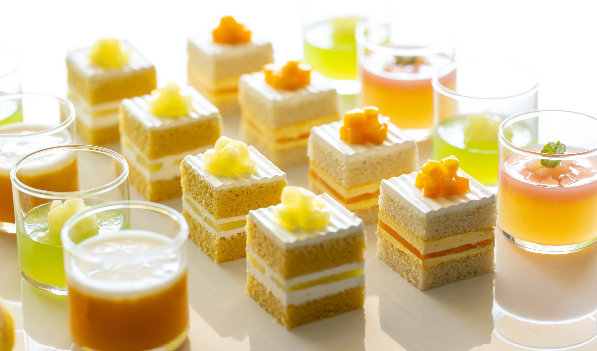 当ビュッフェの魅力は、ホテルニューオータニを代表するシグネチャースイーツであり、素材にこだわったプレミアムな『スーパーメロンショートケーキ』や、国産アップルマンゴーを使用した香り高い濃厚なマンゴーの味わいが引き立つ夏季限定『マンゴーショートケーキ』を含む、全17種類のスイーツをビュッフェサイズでお好きなだけお愉しみいただけること。