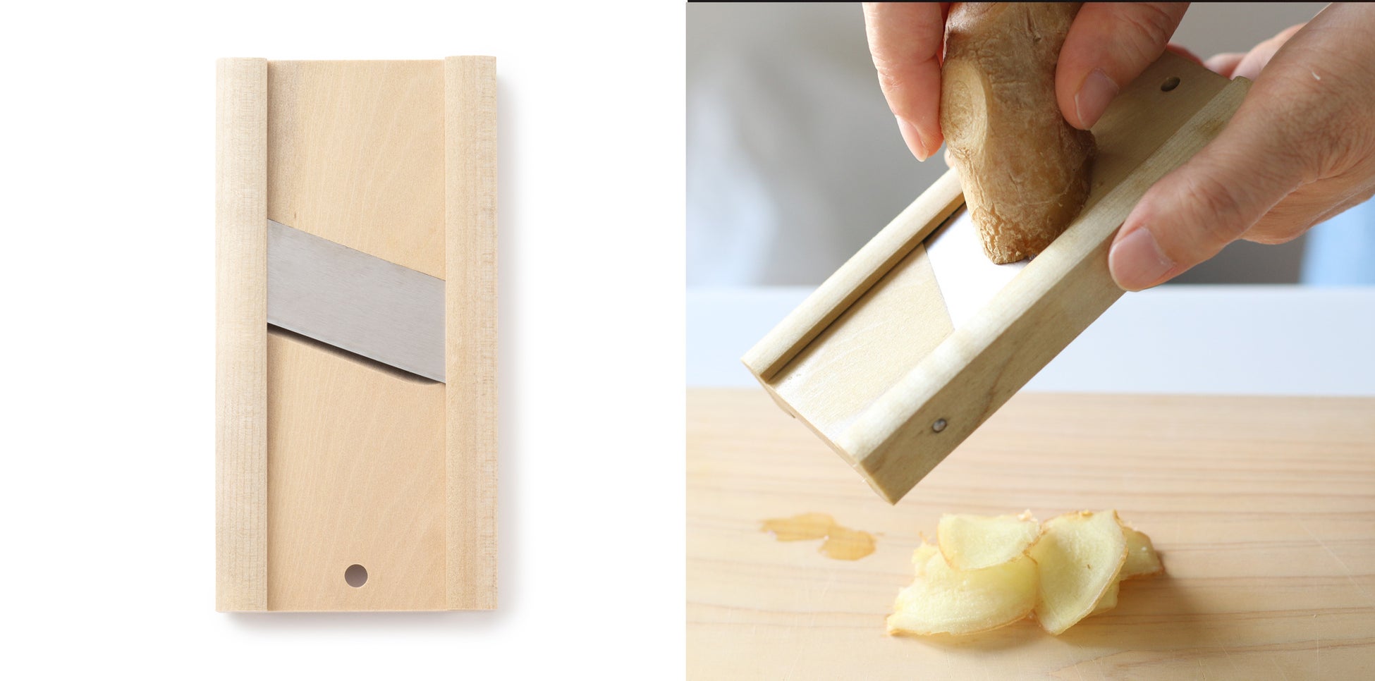 白ネギやみょうが、きゅうりなどをお椀の上で直接スライスすることができる小ぶりなサイズで、食卓に出してもなじむ佇まいのスライサー。包丁職人による本刃付け加工を用いているため、切れ味がとてもよいのが特徴です。本体には軽いホオノキを使いました。