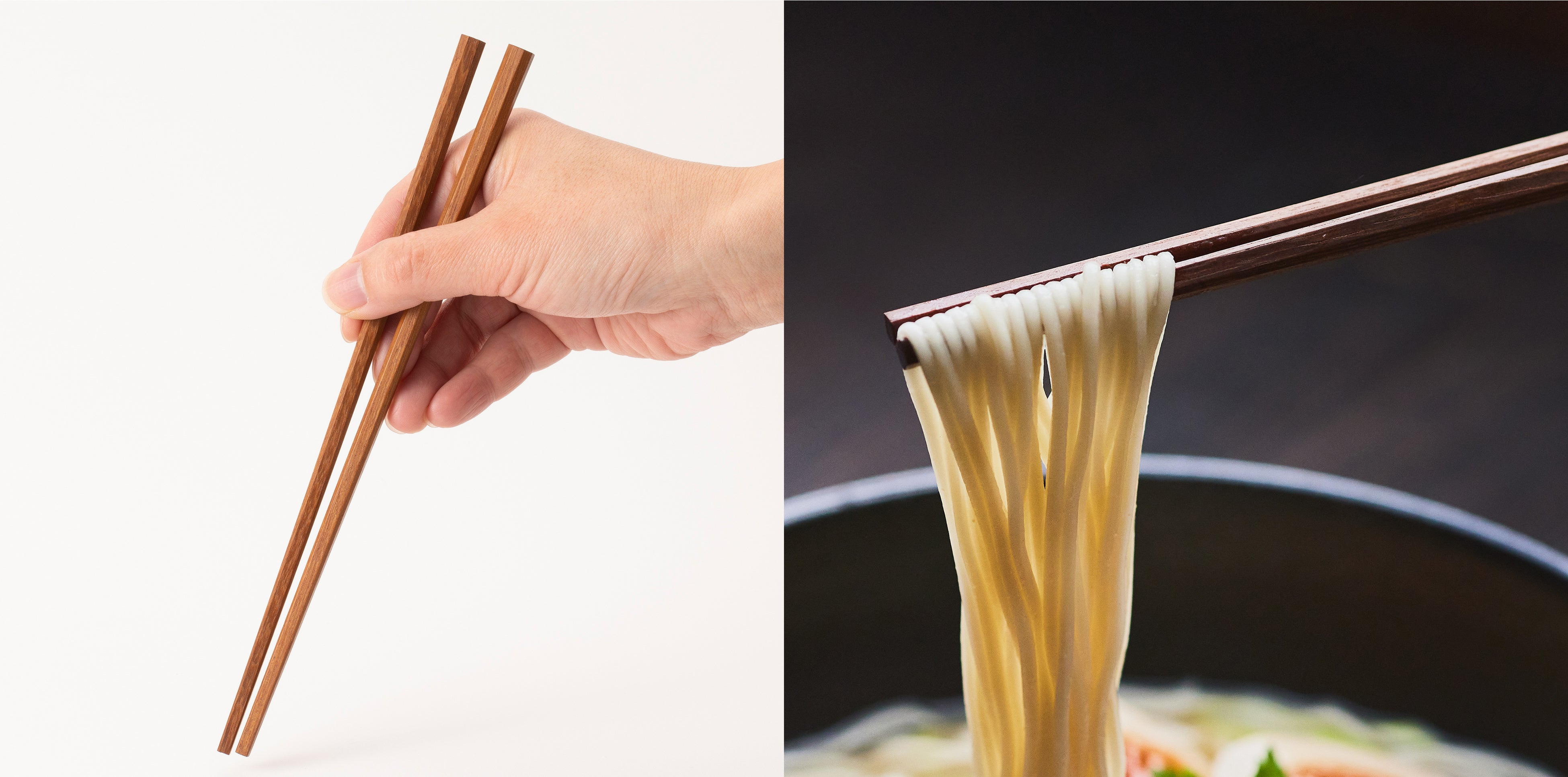 割り箸の麺の食べやすさに着想を得たお箸。箸先は断面が太めの四角で麺がつかみやすく、手に持つ部分は八角で手当たりがよく持ちやすい形に仕上げました。