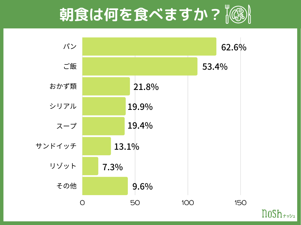 続いて、「毎朝食べる」「時々食べる」「時間がある時は食べる」と回答した人に、いつも朝食にどのような物を食べているのか質問しました。トップとなったのが「パン」62.6%、次いで「ご飯」53.4%、「おかず類」21.8%、「シリアル」19.9%でした。