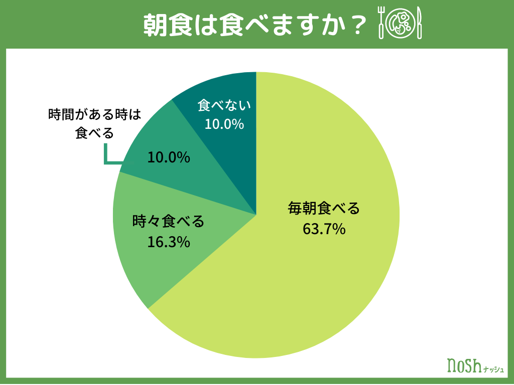 SNSにて「朝食は食べますか?」と質問したところ、「毎朝食べる」63.7%、「時々食べる」16.3%、「時間がある時は食べる」10%、「食べない」10%となり、頻度はそれぞれであっても「朝食を食べる」という回答が90%となりました。