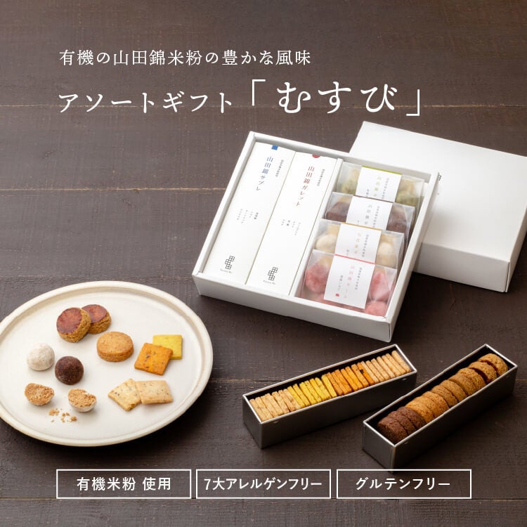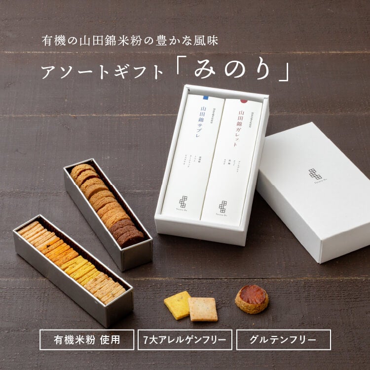 田田田堂の定番焼き菓子「山田錦サブレ」、「山田錦ガレット」、「山田錦ボール」の3種×4フレーバーを詰め合わせたセット。お酒にも合う塩味スナックから、ティータイムを彩るスイーツまで、さまざまなシーンでお楽しみいただける充実の内容です。