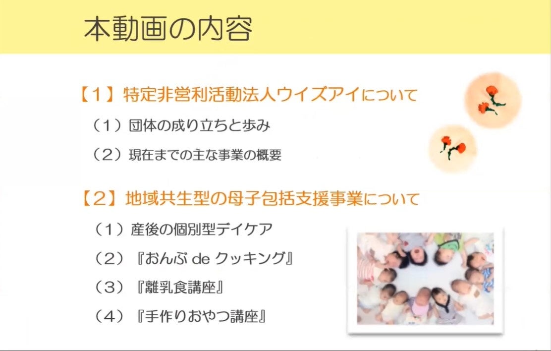 母子のケア、赤ちゃんのサポートを目的とした「個別型産後デイケア事業」など、産後デイケアを中核とした助成団体の活動報告です。「産むのはママにしかできないけれど、育てるのはみんなでできる」とのメッセージで締めくくられました。
