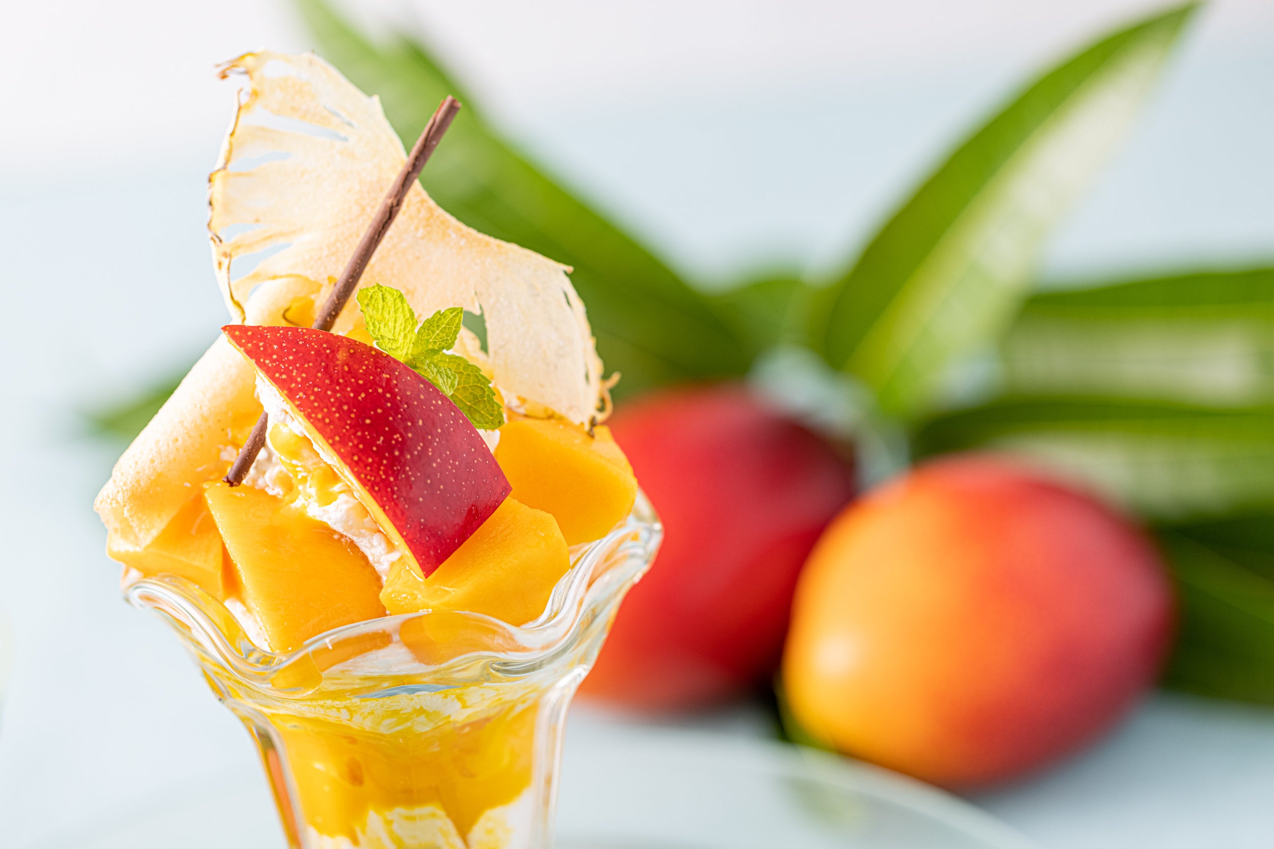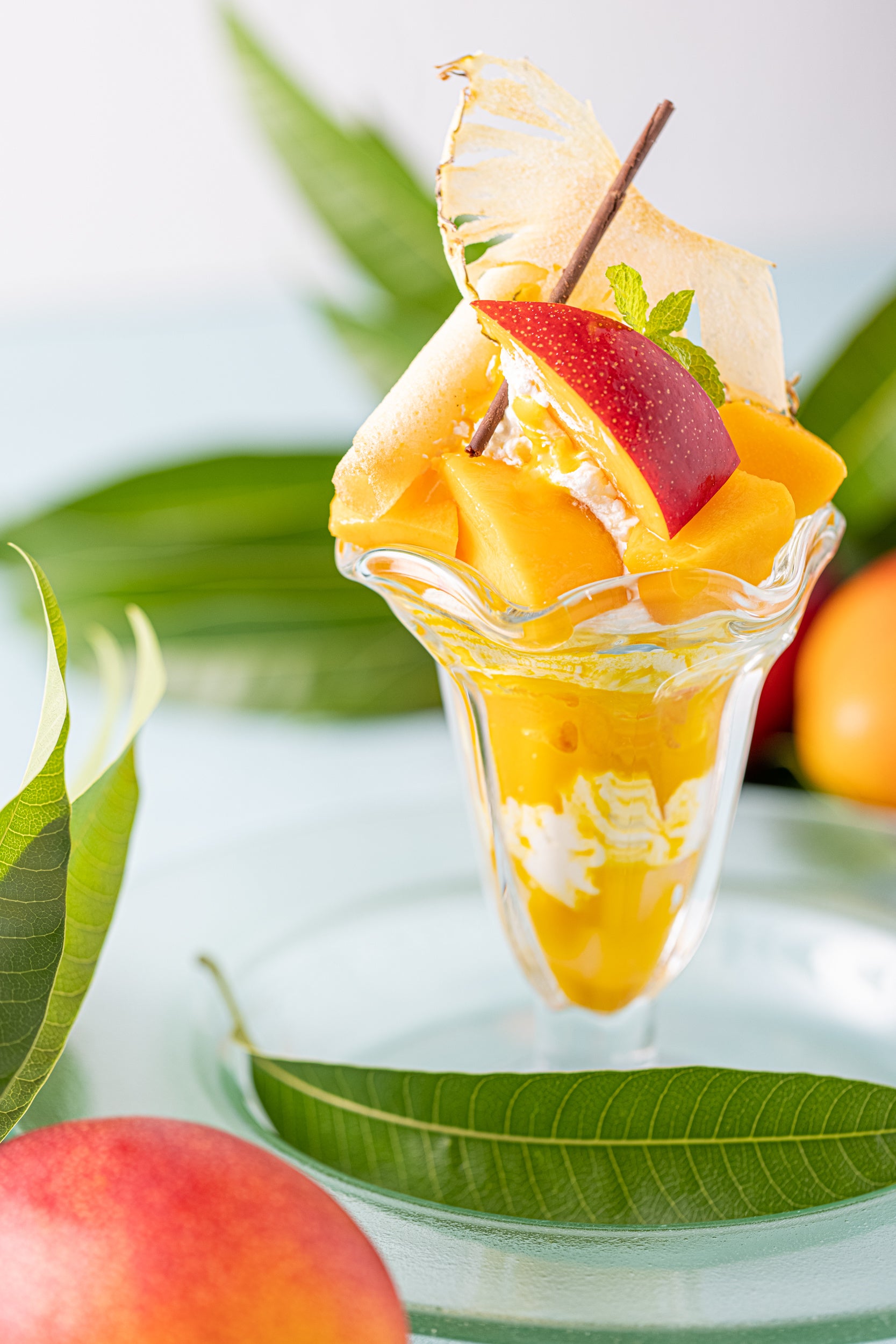 パフェには、伊豆・河津町のマンゴー農家「森ファーム」で採れたマンゴーを中心に、伊豆産のアップルマンゴーとキーツマンゴーを収穫状況や旬に合わせて使用します。香り豊かなアップルマンゴーは柔らかな果肉で糖度が高く、キーツマンゴーは繊維質が少なく口の中で溶けるほどの滑らかな舌ざわりが特徴です。