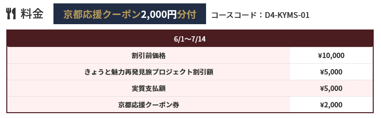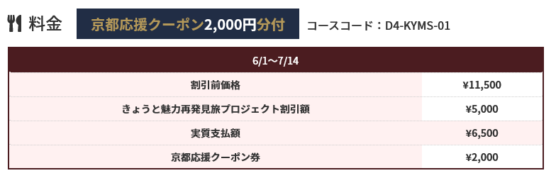 こちらのツアー料金には、往復のハイヤーと対象のお店でのお食事料金と京都応援クーポンが含まれております。