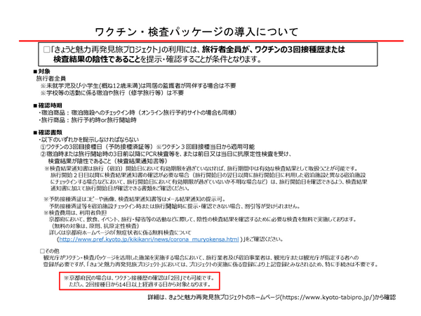 接種済証またはPCR検査等結果通知書(撮影画像、コピー、電子的な証明書でも可)の確認は、同行者も含めて旅行者全員について実施しますので、チェックイン時(旅行会社の場合は予約証明書等お渡しの来店時)にご提示ください。提示のない場合は割引支援を受けることができません。