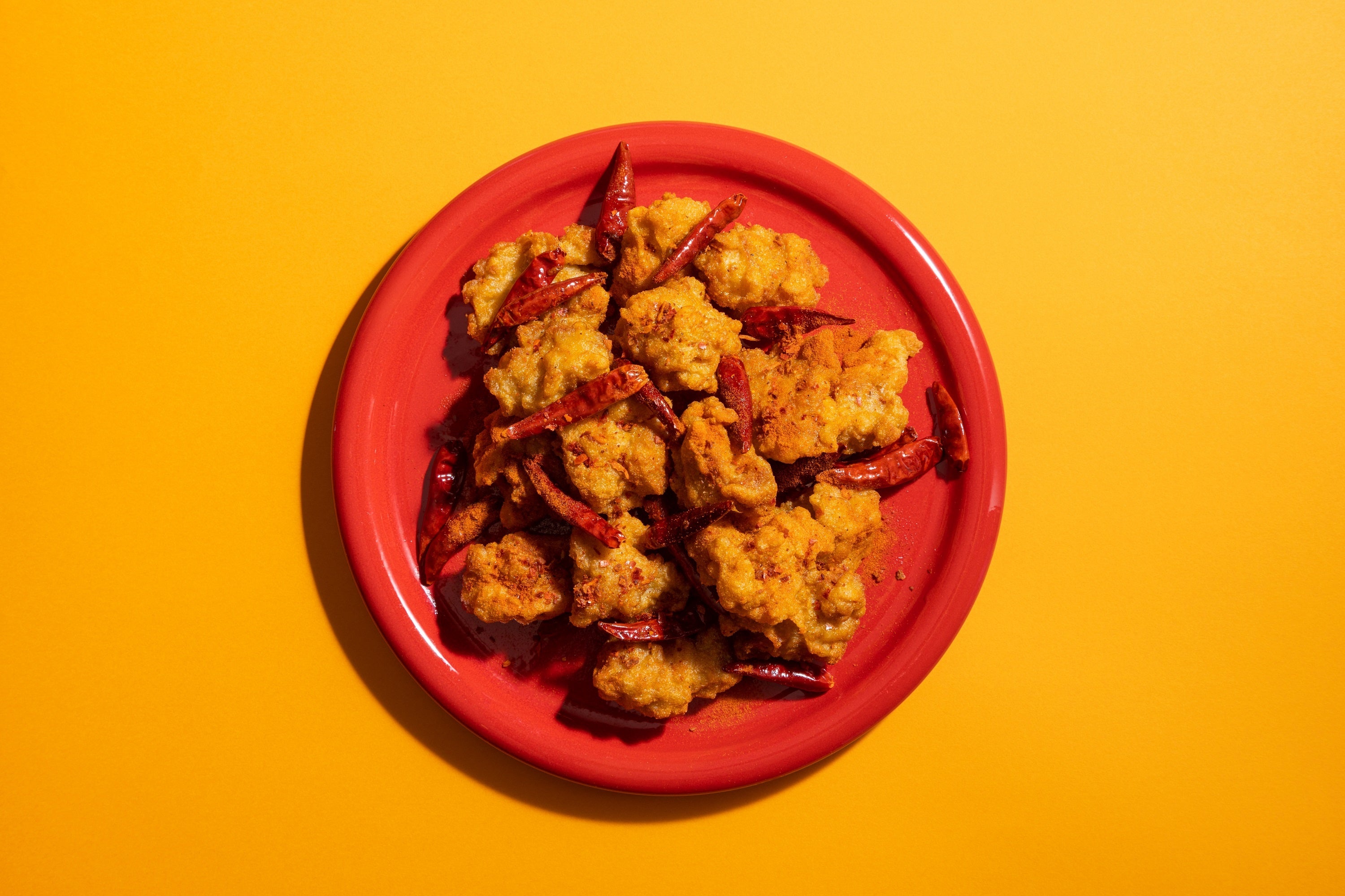 シンプルな唐揚げに、チリパウダー、レモンパウダーを絡め、仕上げに唐辛子オイルを。