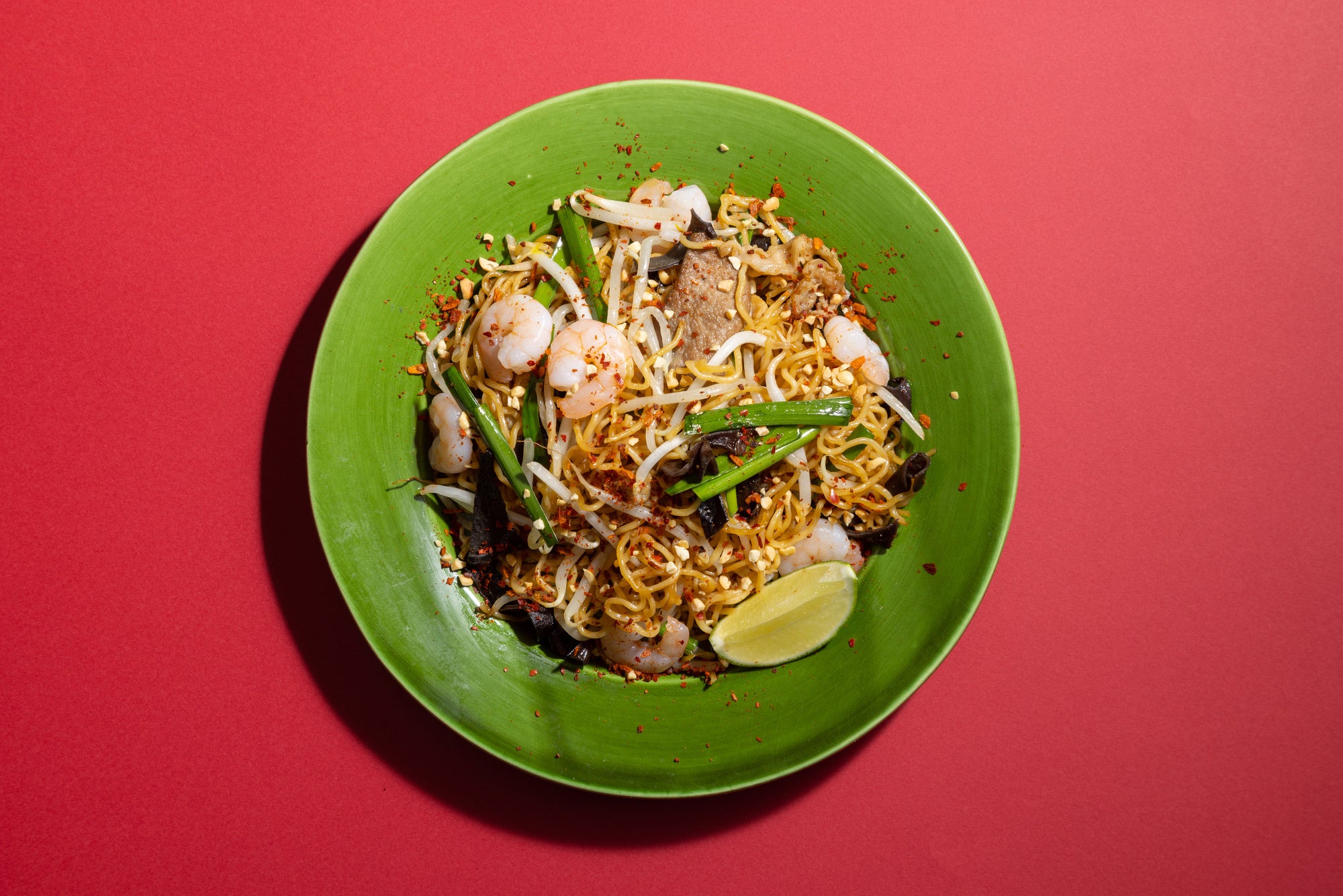 麺はフォーではなく焼きそばの麺を使用しています。オイスターソース、ナンプラー、ライム等で味付けし、具材に豚肉、エビ、もやしでタイ風に仕上げています。