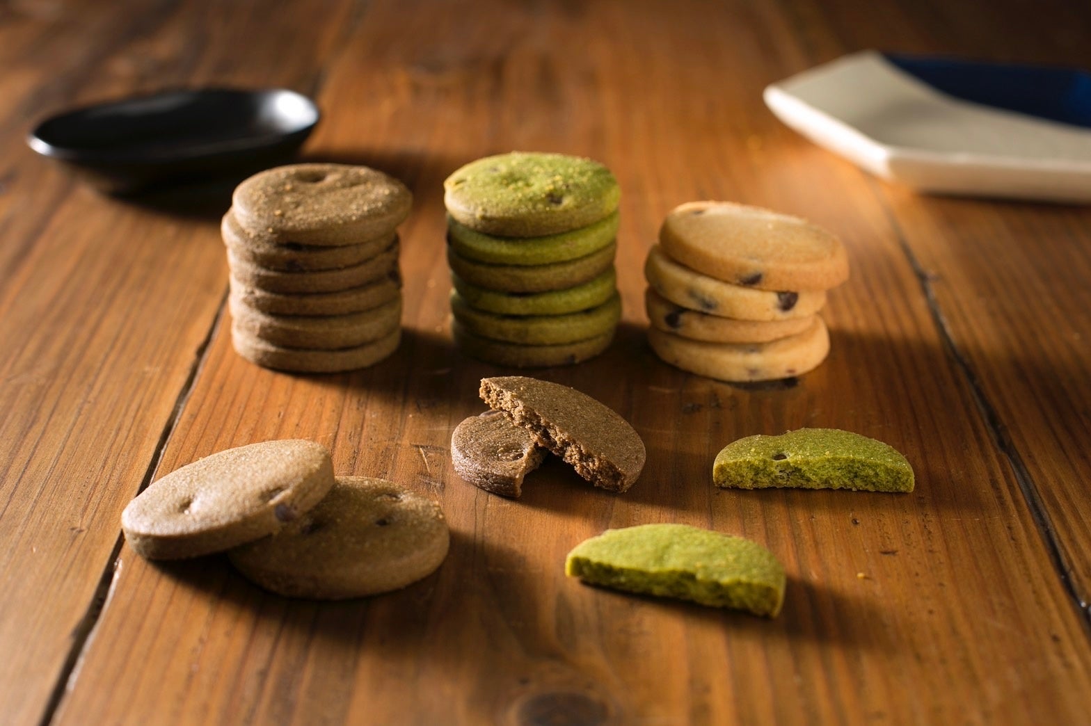 他のクッキーよりも2㎜厚み増しで食べ応えのあるクッキーを3種類(左からほうじ茶・抹茶・きな粉)ご用意しました!ちょこっとチョコを使用した贅沢リッチな味わいをお楽しみください(※毎月1種類入っています)