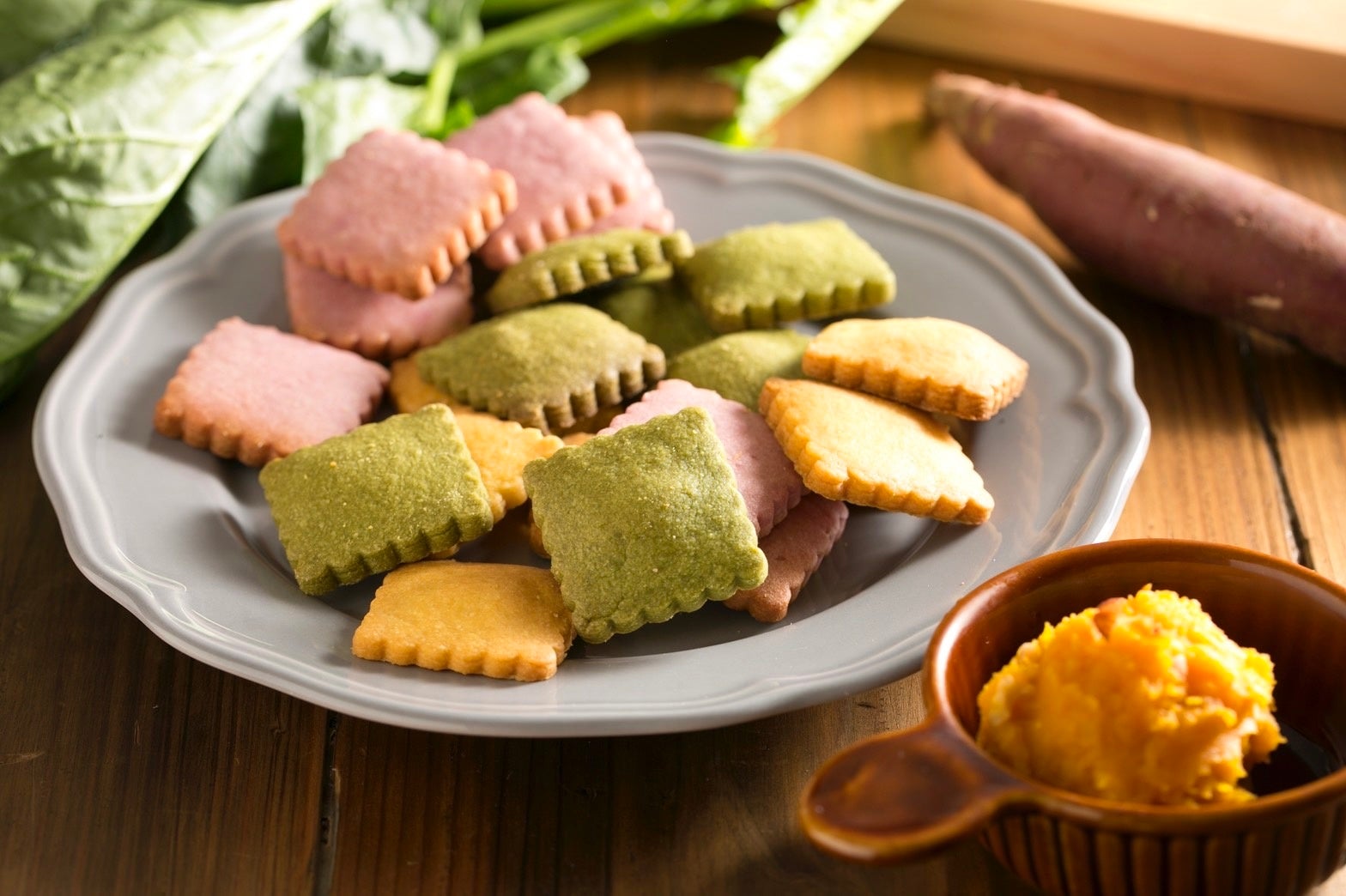 国産野菜100%!添加物なし!栄養豊富な野菜パウダー入りクッキー。お腹にも優しいきび砂糖を使用して、野菜の苦手な方でもお召し上がりやすく仕上げました!