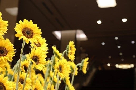 帝国ホテル 東京のメインロビーでは、ひまわりの装花が皆様をお迎えいたします。
